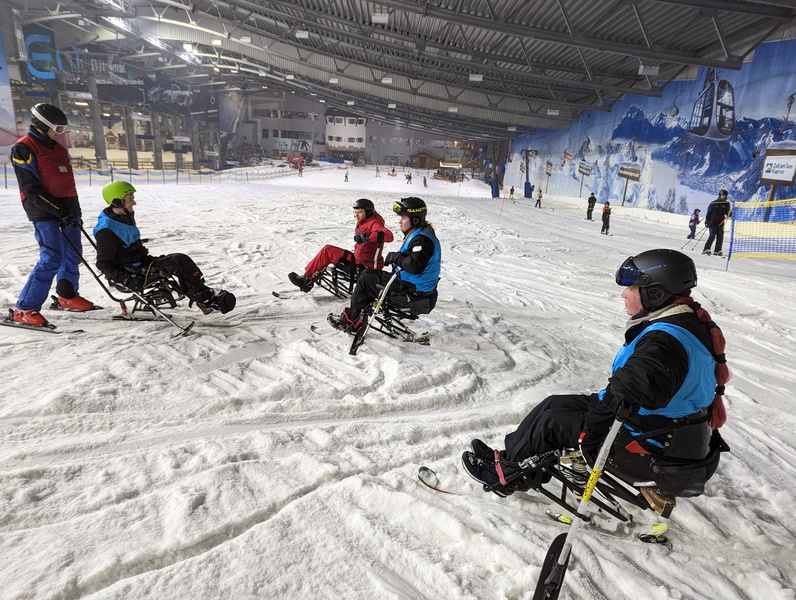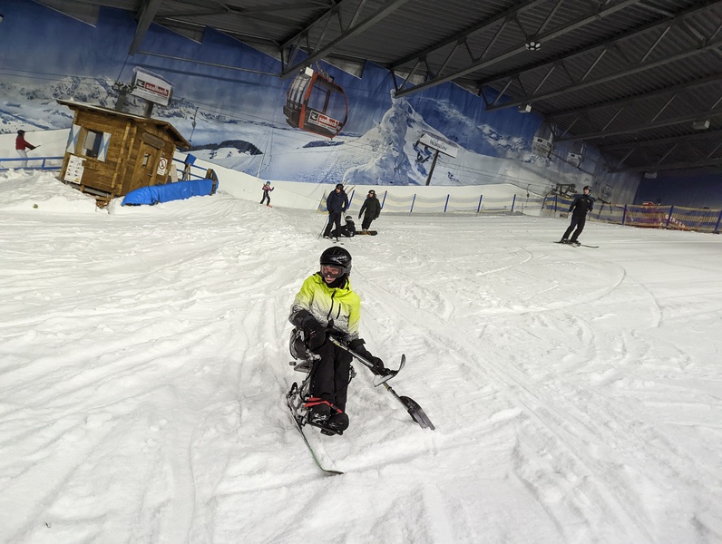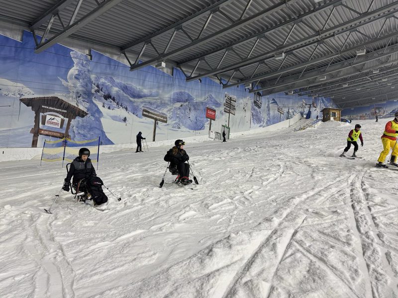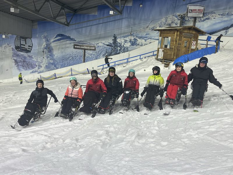 Marius, der seit diesem Jahr dankenswerter Weise unser Monoski-Lehrteam unterstützt, unterrichtete zum ersten Mal in unserem roten Mannschaftsoutfit.